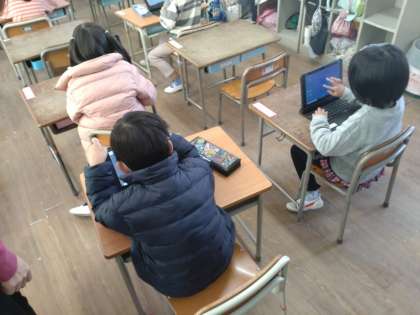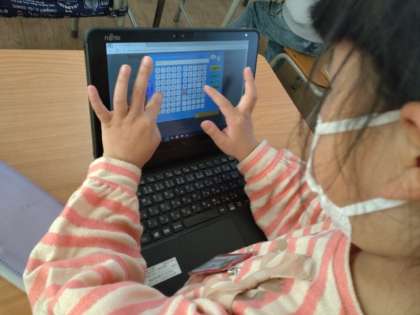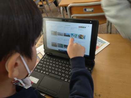 1年生は国語科の時間にタブレットでわからないことを検索する方法を学んでいました。黒板に貼っている大きなQRコードを読み取ると、ヤフーキッズの検索画面になりました。児童は、キーボードに調べたい事柄の文字を打ち込んでいました。今回は初めてなので、各自が興味をもっていることならなんでも調べていいようです。画面にはゲームやアニメ、漫画の絵が……。今回でかなり慣れてきたようです。次回は、課題をもって調べていけそうです。