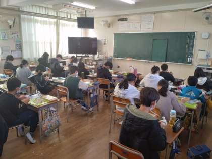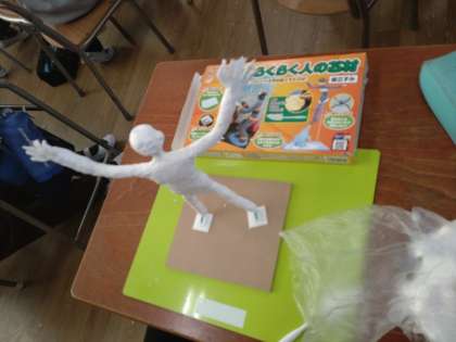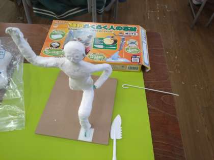 6年生は図画工作科の時間に、紙粘土で人の動くところを工作していました。おそらくスポーツをしている様子を表しているのでしょう。「らくらく人の芯材」という工作キットを骨組みに使いながら、紙粘土で肉付けして、力強い人の動きを表しています。着色していくと、さらにリアルなスポーツ選手ができ上がることと思います。
