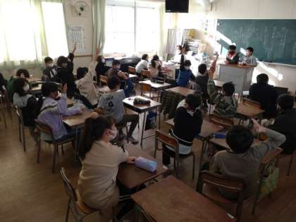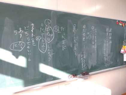 5年1組では学級活動の時間に、お楽しみ会で遊ぶ内容を話し合っていました。係の児童が前で、話し合いを進めていました。黒板には話し合いの流れが表れていました。「運動場14、教室8」遊ぶ場所を決めていたようです。「ドッジボール10、だるま?(消えている)、ポートボール1」さらにドッジボールには「ふ(普通のドッジ)14,王(様ドッジ)6」とありました。その流れで「だ(だるまさんが転んだ)・ド(ドッジボール)・王ド(王様ドッジボール)に決まったようです。続きにはチーム分けの工夫も話し合われていました。