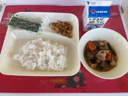 1月11日(水)の給食は、ごはん・牛乳・筑前煮・じゃこ豆・焼きのりです。筑前煮は、福岡県で昔から食べられてきた伝統的な料理です。福岡県では「がめ煮」と呼び、正月や祭り、祝い事の時によく食べられます。昔、福岡県に「筑前の国」といわれる地域があったことから、「筑前煮」と呼ばれるようになりました。にんじんやレンコン、ごぼうなど、根菜類を軟らかくなるまで煮込んで旨味をたっぷりと含んだ一品です。