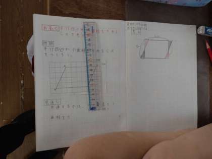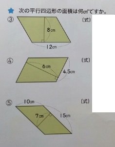 図形の面積2 公開日 2023/01/13 更新日 2023/01/13 お知らせ 平行四辺形の面積を求める公式をつくることができました。残りの時間は、教科書や算数ドリルの練習問題を解いていきます。公式がつくられても、実際に使えなければいけません。 次のような問題が出題されていました。「あれ、底辺がないぞ?」「高さはどこだ?というつぶやきが聞こえてきそうです。見方を変えて、わかった児童が増えてきました。できた児童から先生に見せて、答え合わせをしていました。 いいね(0)