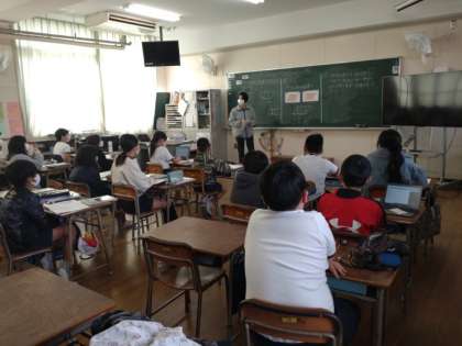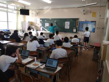 前時に平行四辺形の面積を求めました。補助線を入れて切ったり動かしたり工夫して、平行四辺形の面積が出せたようです。本時では、公式を考えます。「(辺)×(辺)」など、児童から知恵を絞って、いろいろな案が出されていました。より活用しやすい公式を話し合っていました。