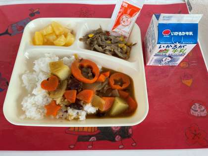 1月16日(月)の給食は、牛肉と金時豆のカレーライス・牛乳・ごぼうサラダ・パインアップル(カット缶)です。ごぼうは、根の部分を主に食べる野菜の一つです。根が細くて長い種類のものがよく食べられています。給食では、きんぴらごぼうやサラダ、煮物として登場します。ごぼうは、お腹の調子を整える食物繊維などを多く含んでいます。コーンを加えて、マヨネーズが味を引き立てています。