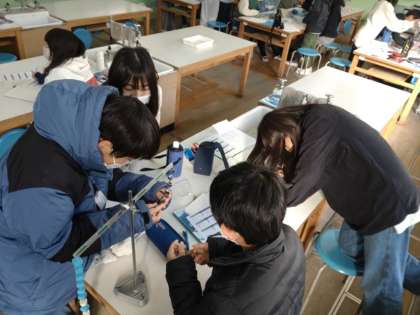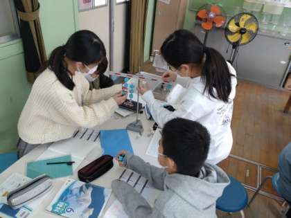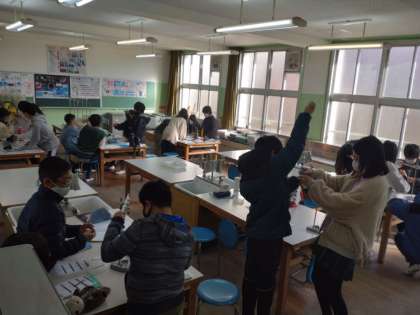 6年生は理科で「てこのはたらき」を学習しています。前時までに、てこのうでを傾けるはたらきは、「おもりの重さ」×「支点からの距離」で表されること、傾ける働きが左右等しい時に、てこは水平に釣り合うことを学びました。本時では、てこのうで、左右とも、何か所かにいくつかおもりをつけて、そのきまりについて実験で調べていました。微妙な計算式になりますが、計算間違いがないように実験していました。だんだん法則に気づいたようです。