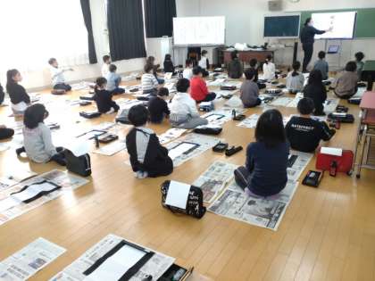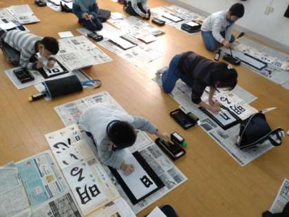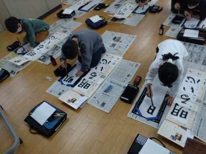 明るい心 公開日 2023/01/20 更新日 2023/01/20 お知らせ 3年生は書写の時間、「明るい心」の書き初めに取り組んでいました。場所は多目的室に移動して、床に用意をセッティングしました。大型テレビで「明るい心」を書く上での注意点が説明されました。 それでは、書き始めます。机に座って書くのとは少し勝手が違いました。筆を立てて書くことがなかなか難しかったようです。それでも2時間かかけて集中して書いていました。 いいね(0)