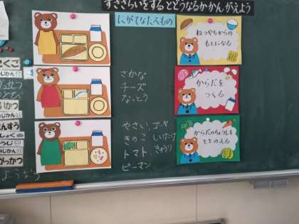 1年生は栄養指導で「すききらいを すると どうなるか かんがえよう」について学習しました。以前食べ物には3つの色のグループがあって、「熱や力のもとになる」「体をつくる」「体の調子を整える」働きがあることを学びました。本時では、それぞれのグループの食べものを食べないとどんな影響があるのか知り、好き嫌いしないように話し合っていました。