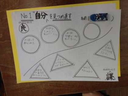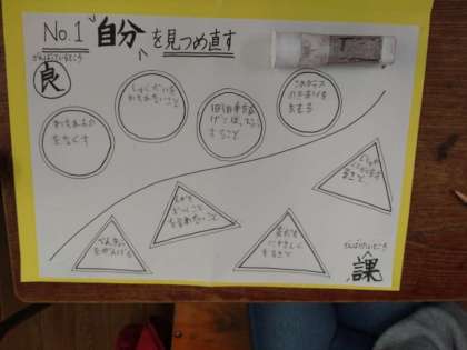 5年2組では学級活動の時間に「自分を見つめ直す」という題で、ワークシートに取り組んでいました。「がんばっている良いところ」を4つ、「これからがんばりたいところ、課題」を4つ描き入れるようです。