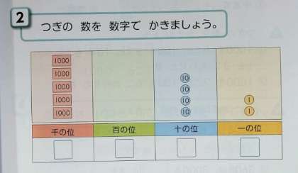 位に数がないとき 公開日 2023/01/24 更新日 2023/01/24 お知らせ 2年生では算数科で「10000までの 数」を学習しています。1組では「次のように、百の位に数がないとき、どのように描きから和せばいいのか考えました。数字で表すとき、漢数字で表すとき。それぞれ「0」をどのようにすればいいのか、それぞれの考えをノートに書いていました。 空位があるときには、読んだり計算したりするのに気をつけなければいけません。早く慣れてほしいと思います。 いいね(0)
