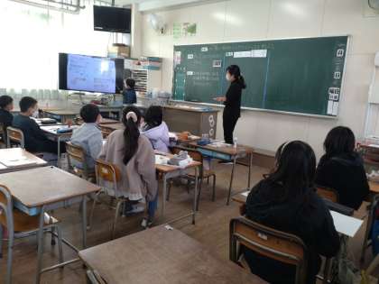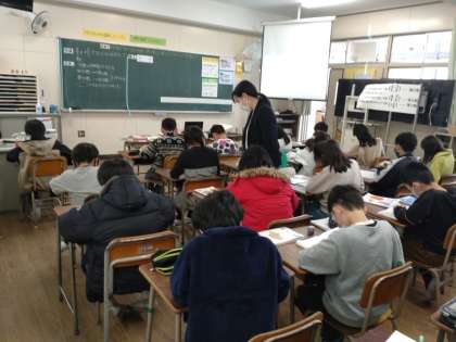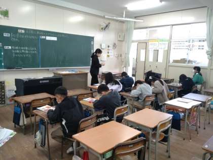 4年生は算数科で「分数」を学習しています。前時までに帯分数・仮分数・真分数について学んできました。本時では、仮分数と帯分数の大きさを考えます。8/5と1 2/5、どちらが大きいかを話し合っていました。一見すると比べられませんが、整数どうし、分子どうし、直接には比べられません。「帯分数を仮分数に直して比べる。」「仮分数を帯分数に直して……。」「数直線で……。」自分なりの見通しを立てて考えていました。