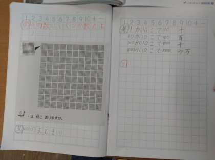 点の数を数えよう 公開日 2023/01/27 更新日 2023/01/27 お知らせ 2年生は算数科で「10000までの 数」を学習しています。1組では次のように、たくさん並んでいる点の数を数える問題を考えていました。数え方の見通しでは、点を10個ずつ数え、10が10個で100個、100が10個で1000個……。このように数えていくのがよい方法のようです。 では、1000が10個で何個になるのでしょうか。 いいね(0)