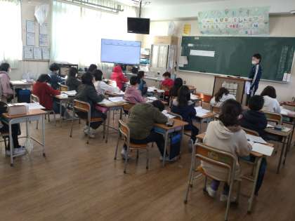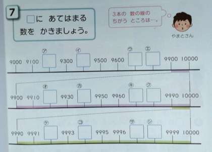 2年生は算数科で「10000までの 数」を学習しています。1組では次のように、10000まである数直線上の数字の読み方を考えました。1めもりは「10」なのか、「100」なのかをつかむことが大切なようです。