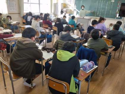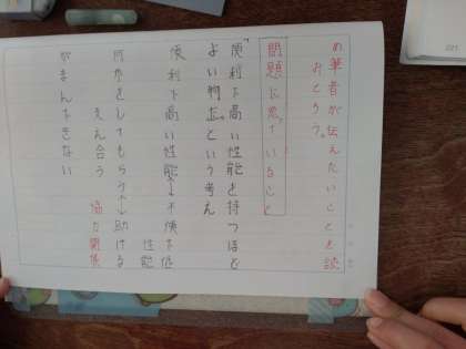 5年生は国語科で「テクノロジーの進歩について考えよう」を学習しています。1組では、説明文を読んで、「便利で高い性能を持つロボットの方がよいものだ。」という考えに対して、問題点はないのかを話し合っていました。「弱いロボットだからこそ、助け支え合える、協力関係に慣れる」などの意見も出てきました。難しい課題ですが、児童は一所懸命考えていました。