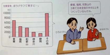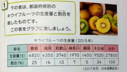 帯グラフと円グラフ1 公開日 2023/02/01 更新日 2023/02/01 お知らせ 5年生は算数科で「帯グラフと円グラフ」を学習しています。次のように、都道府県別でのキュイフルーツの生産量が表と棒グラフで表されています。本時では、キュイフルーツの生産量の割合をどんなグラフで表すのがよいか考えました。 割合を棒グラフで表せないでしょうか?棒グラフは数の大きさを比べるのに向いていますが、個々では適していないようです。 いいね(0)