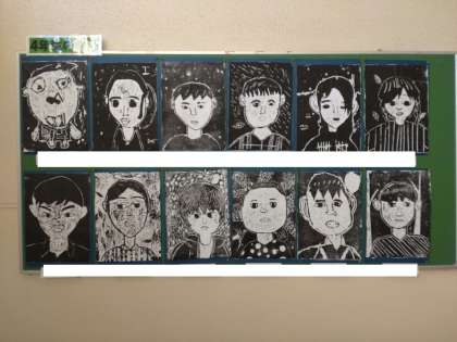 4年生の掲示板に図画工作科で取り組んだ木版画の作品が展示されていました。自分の顔を版画で描いていました。肌の部分を彫らなければいけないので、結構広い面積を彫刻刀で彫らなければいけません。どの作品も表情豊かな力作です。