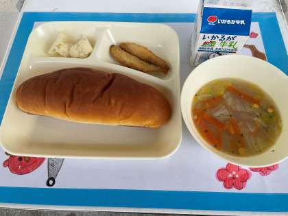 2月6日(月)の給食は、おさつパン・牛乳・わかさぎフライ・コーンと白菜のスープ・カリフラワーのサラダです。わかさぎは、海で成長して卵を産む時期に川を上ってくるものと、湖にすんでいるものにわかれています。天ぷらやフライが代表的な料理で、骨が軟らかく、丸ごと食べることができる魚です。さくっと揚がって美味しいです。