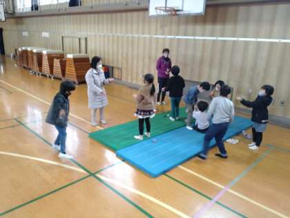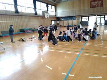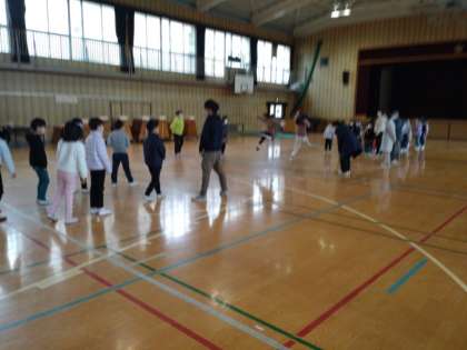 数人が前に呼ばれてけん玉を試しましたが、見ているほどはうまくいかないようです。全員でゴム跳びをするとき、頭の高さほどあるゴムを先頭の地域の方が足に引っかけて低くして、次の下級生が跳び越しやすくしていました。昔、近所でゴム跳びをするときに、上級生が下級生を助けていた技です。昔はこのようにして縦のつながりをつくっていったと思い出しました。