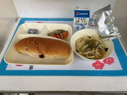 2月13日(月)の給食は、レーズンパン・牛乳・豚肉とごぼうの煮もの・なにわうどん・固形チーズです。なにわうどんは、きつねうどんをイメージしています。三角形に切って、甘辛く煮た薄揚げ、かまぼこ、はくさい、青ネギが入ったうどんに、とろろこんぶを入れて食べます。きつねうどんは、大阪で生まれたと言われています。また、とろろ昆布は、昔から大阪でつくられていることから、大阪市の給食では「なにわうどん」と呼んでいます。出汁が効いたつるつるのうどんで、揚げやとろろ昆布が味のアクセントになっていて、とても美味しかったです。
