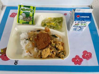 2月15日(水)の給食は、かつ丼・白菜の甘酢あえ・抹茶大豆です。かつ丼は、卵の個別対応です。、抹茶大豆は、炒り大豆に香りのよい抹茶とほのかな甘さが特徴であるキビ糖を絡めて作られています。抹茶は、てん茶というお茶の葉を石うすで粉にしたもので、キビ糖はサトウキビから作る茶色の砂糖です。抹茶大豆を口の中へ放り込みポリポリと噛むと、じわっと甘さとお茶の味わいがします。まさに美味しいおやつと言えます。