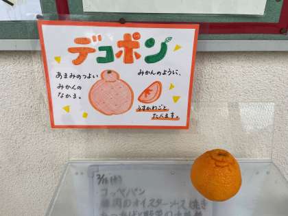 次の写真は、給食室前に設置したデコポンの紹介です。デコポンの甘酸っぱさによって豚肉を食べた後の口の中が爽やかに感じられます。