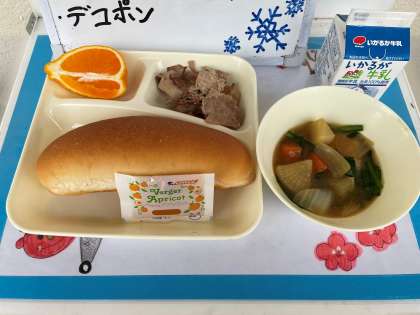 2月16日(木)の給食は、コッペパン・アプリコットジャム・牛乳・豚肉のオイスターソース焼き・厚揚げと野菜の中華煮・デコポンです。豚肉は、赤のグループの食べものです。豚肉には、主に体をつくるもとになるたんぱく質が多く含まれています。また、体の疲れをとる働きがあるビタミンB1も多く含まれています。
