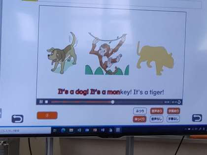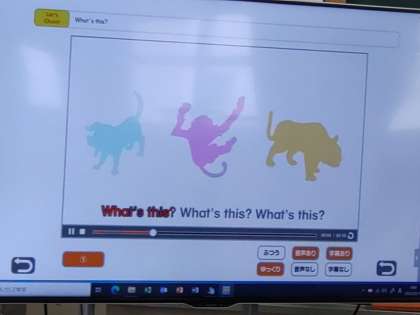 3年生は外国語活動で「What’s this?」の学習をしていました。ナターニャ先生が「What’s this?」と発音し、続いて児童が同じように「What’s this?」と繰り返します。次は先生の「What’s this?」の問いかけに児童が「It‘s a book.」と答えます。その後、大型テレビの映像を観て、音楽のリズムに合わせて歌いました。「It‘s a dog. It‘s a monkey. It's a tiger.」