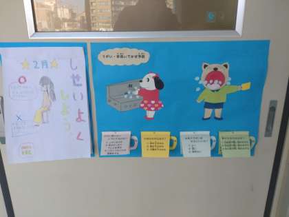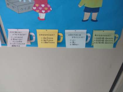 うがい・手あらいでかぜ予防 公開日 2023/02/17 更新日 2023/02/17 お知らせ 保健室のドアに「うがい・手あらいでかぜ予防」が掲示されていました。「『かぜにまけないようにするには?』(1)くすりをのむ(2)夜おそくまでテレビを見る(3)バランスのとれた食事をする」など3択クイズが載っています。めくったら解答がすぐにみられるので、保健室前を通るときに気軽にクイズができます。 その横には、健康委員会から2月の目標「しせいよくしよう」も掲示されていました。 いいね(0)