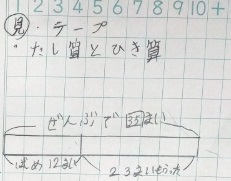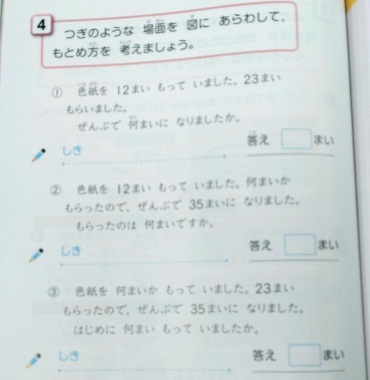 もんだいの 考え方 公開日 2023/02/20 更新日 2023/02/20 お知らせ 2年生は算数科で「もんだいの 考え方」を学習しています。次のような問題が並んでいます。問題文をよく読んで式を立てます。この単元では、問題文をテープ図に表して、たし算になるのかひき算になるのかを考えて式を立てなければいけません。さしを使って、ノートに正確にテープ図を書き込んでいました。 いいね(0)