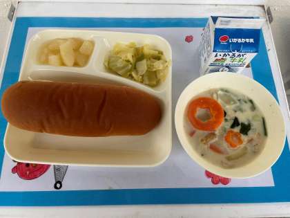 2月24日(金)の給食は、黒糖パン・牛乳・ほうれんそうのクリームシチュー・キャベツのサラダ・洋なし(カット缶)です。給食では料理に合わせて、ホワイトルウ・ブラウンルウを手作りしています。ホワイトルウは、小麦粉を油やバターなどで焦げ色がつかないように炒めて作る白色のルウです。グラタンやクリームシチューなどに使われています。