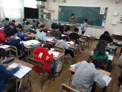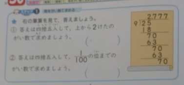 4年生は算数科で「小数のかけ算とわり算」の学習をしてきました。本時では、学習内容のまとめの意味を込めて、教科書や算数ドリルの問題を解いていました。算数ドリルには次のような問題がありました。「25÷9」を計算するのに、「答えは四捨五入して、上から2けたの概数で表しましょう。」と「答えは四捨五入して、1/100の位までの概数で求めましょう。」では答えが違ってきます。計算ができても気を抜かず、問題を最後まで読んで正しく答えを求めてほしいです。