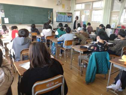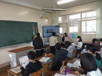 5年生は英語科で「あこがれの人の職業などを尋ねる」を学習しています。一人ずつヒアリング・スピーキングのテストでした。まずナターニャ先生から1人ずつ呼ばれて前に出ます。大型テレビの画面を見ながら、先生から「Who is he?」「What sports can he play?」など問いかけられます。ナターニャ先生の話を聴いて英語で正しく答えなければいけません。自分の順番を待っている間、ペーパーテストをします。