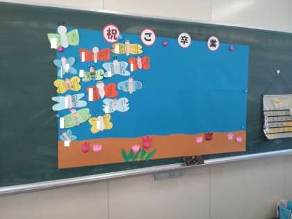 卒業生へのメッセージカード 公開日 2023/02/28 更新日 2023/02/28 お知らせ 2年2組では学級活動の時間に、卒業生へ送るメッセージカードを作成していました。蝶が広げた羽に素敵な模様やメッセージを書き込みます。委員会活動や縦割り班活動、なかよし遠足でお世話になったことを思い出してお礼の文章を考えていました。できあがったちょうは、お花と一緒に模造紙へ貼りつけていきます。1組の作品と合わせて、贈る言葉にあふれた素敵な花園になりそうです。 いいね(0)