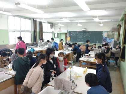 冷やしたときの変化 公開日 2023/03/02 更新日 2023/03/02 お知らせ 4年生は理科で「水のすがた」について学習しています。本時では。、水を冷やし続けたときにどのように変化するかを実験して調べました。実験器具をセットする人、温度計のめもりを読む人、記録する人、時間を測る人など、班の中で役割をしっかり分担して協力して実験を進めていました。 何度のところで水が変化しだしたか、水はどのように変化してきたかなど、話し合ってノートにまとめていました。 いいね(0)
