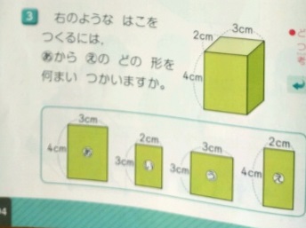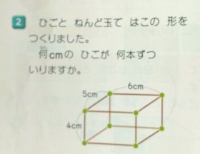 「何cmのひごが何本必要か」「どの形を何枚使うか」 公開日 2023/03/06 更新日 2023/03/06 お知らせ 2年生は算数科で「ほこの 形」を学習してきました。1組では、「たしかめポイント」まとめの問題を解いていました。(2)の問題では何cmのひごが何本必要か、(3)の問題では(あ)〜(え)のどの形を何枚使うか、どちらの問題も空間で辺や面を認識する力が問われています。2年生にとって考えにくい問題ですが、立体模型を使って考えていました。 いいね(0)