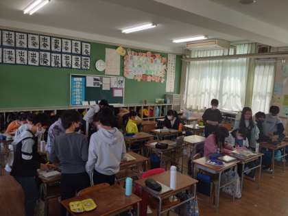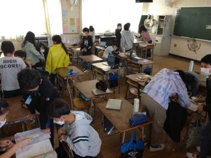 5年2組では学級活動の時間にグループに分かれて何か作業をしていました。入ろうとすると「校長先生は入らないで。」と止められました。何か企画しているようです。そう言えば何やら招待状を各教職員へ配っていたような……。