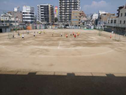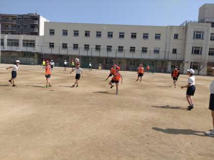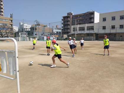 サッカー 公開日 2023/03/10 更新日 2023/03/10 お知らせ 5年生は体育科で「ボール運動(ゴール型)サッカー」に取り組んでいます。2組では学級を4チームに分けて試合をしています太。ゴールの代わりになっている防球ネットは広いようで案外狭いようです。相手守備陣を突破してシュートしてもゴールとはなかなかいきません。パスをもらえる位置、シュートが入りそうな位置を考えて、盛んに動き回っていました。 いいね(0)