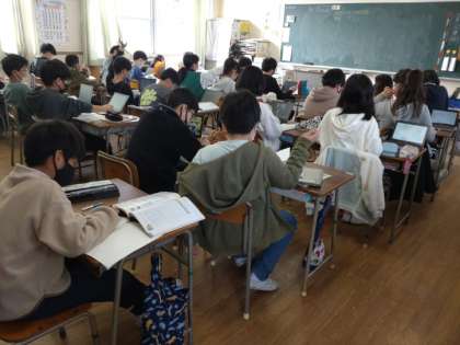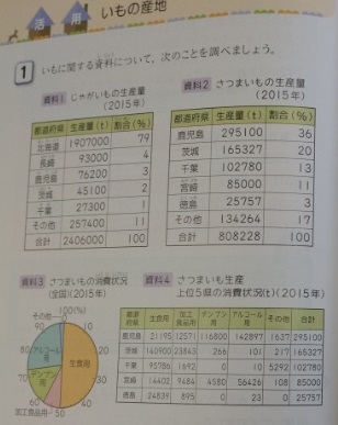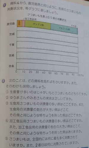 円グラフと帯グラフの活用問題 公開日 2023/03/10 更新日 2023/03/10 お知らせ 5年生は算数科で学んだことの活用問題に取り組んでいます。1組では、イモの生産や消費に関する表・円グラフ・帯グラフなどの資料についての活用問題を考えていました。(1)では、イモの消費について帯グラフに表します。複雑な計算が必要なので計算機を使うようです。(2)では各説明がどの資料から読み取った内容かを答えます。 いいね(0)