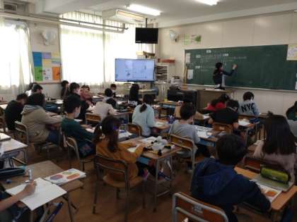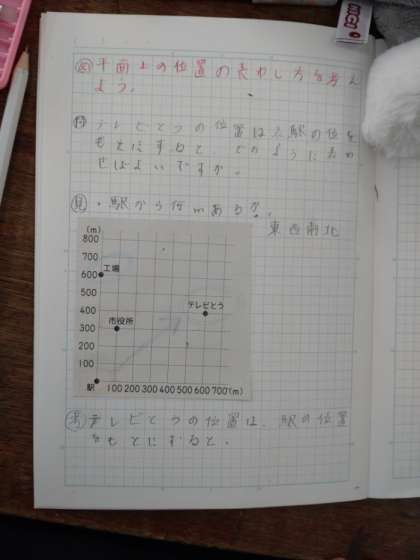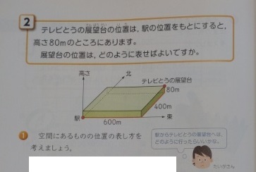 平面上の位置の表し方 公開日 2023/03/10 更新日 2023/03/10 お知らせ 4年生は算数科で「直方体と立方体」を学習してきました。本時では、次のように、テレビ等の展望台の位置は駅の位置をもとにすると、どのように表せるのか、直方体や立方体の性質を利用して考えました。空間にあるものの位置は、3つの長さの組で表せるようです。空間でとらえるのは4年生にとって難しいですが、がんばって考えていました。 いいね(0)