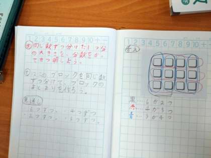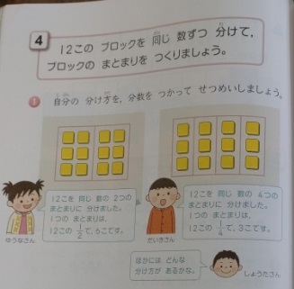 12個のブロックを同じ数ずつ分ける 公開日 2023/03/13 更新日 2023/03/13 お知らせ 2年生は算数科で「分数」を学習しています。1組では、下のように縦3個、横4個並べられたブロックを同じ数ずつ分けたときの1つ分の大きさを分数でどのように表すのかを考えていました。児童のノートには、何通りもの分け方が図にかき込まれています。それぞれの分け方について説明しなければいけません。分数の仕組みを理解して、正しく説明できたでしょうか。 いいね(0)