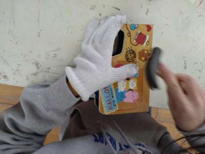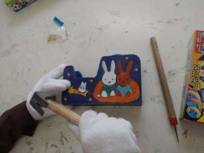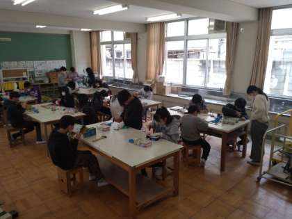 6年生は図画工作科で「テープカッター作り」を進めています。卒業制作ともいえるような小学校での思い出になるテープカッターです。丁寧なデザイン画を施し、ピカピカにニスを塗っていることころに、児童が心を込めて制作していることがうかがえます。釘を打って最後の組み立て作業に取り掛かっています。