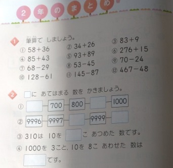 2年のまとめ 公開日 2023/03/20 更新日 2023/03/20 お知らせ 2年生は算数科で「2年のまとめ」について取り組んでいます。1組では、「たし算と ひき算の ひっ算」「10000までの 数」「かけ算」の単元について、練習問題の答え合わせをしながら復習していました。基本的な計算や数のしくみについての問題が続いています。しっかり理解して3年生になってほしいです。 いいね(0)