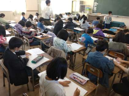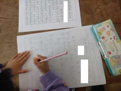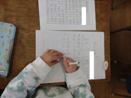 1年生は国語科の時間に「1年間で いちばん たのしかったこと」の作文に取り組んでいました。前時までに下書きを書いてタブレットに入力しました。その文章を先生が推敲して手本ができました。児童は、その手本をしっかり見て清書をしていました。手本を絶対に写し間違えないという強い気持ちをもって、清書していました。