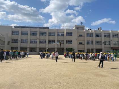 昨晩の雨がなかったかのような青空のもと、児童朝会が行われました。