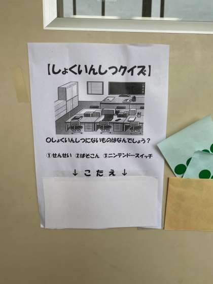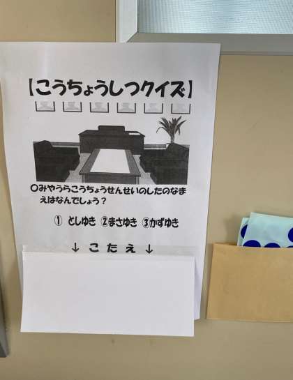 校長室前で、子どもたち:「入っていい?」。校長:「そうぞ、入ってください」の会話。