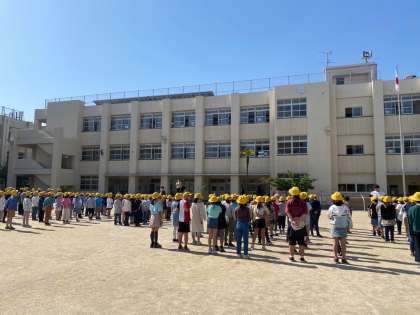 快晴の空のもと、児童朝会が行われました。
