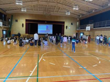 今日は、ぱらぱら雨が降っていましたので、体育館での朝会になりました。
