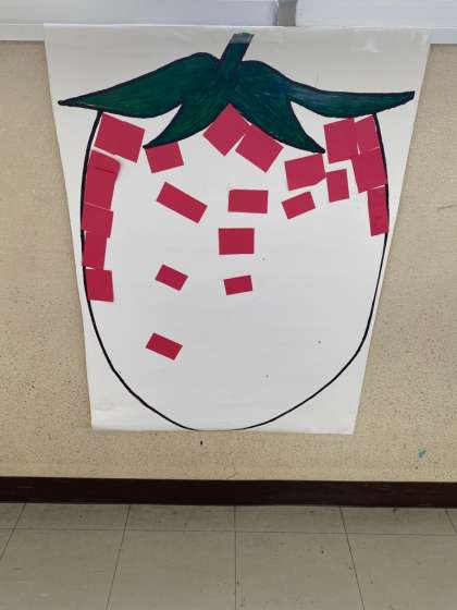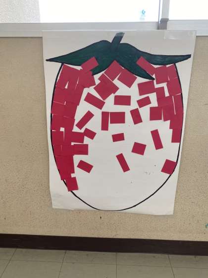 子どもたちは、教室前に貼ってある大きな紙に、もらった赤い紙を貼り付けます。