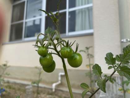 2年生のミニトマトは、たくさんの実をつけています。まだ、熟していませんが。