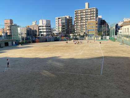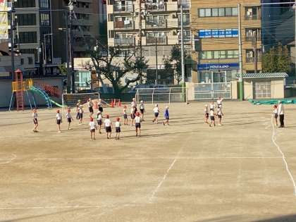 野外運動クラブが、運動場で、サッカーをしています。