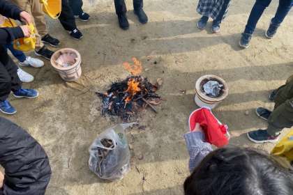 落ち葉や枯れ枝を集め、たき火体験、