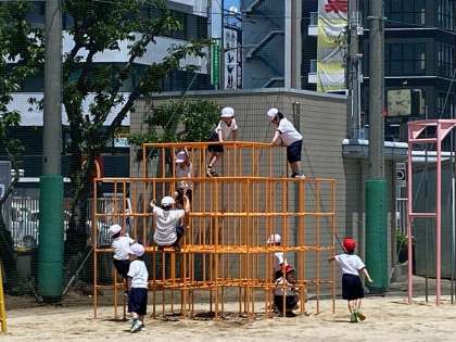 広い運動場で、1年生が活動しています。